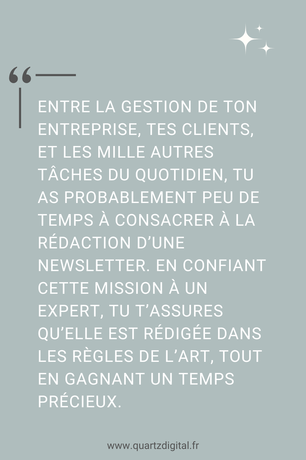 En confiant cette mission à un expert, tu t’assures que ta newsletter est rédigée dans les règles de l’art, tout en gagnant un temps précieux. Tu pourras te concentrer sur ton cœur de métier, sur ce que tu fais de mieux, tout en ayant la certitude que ta communication est entre de bonnes mains.